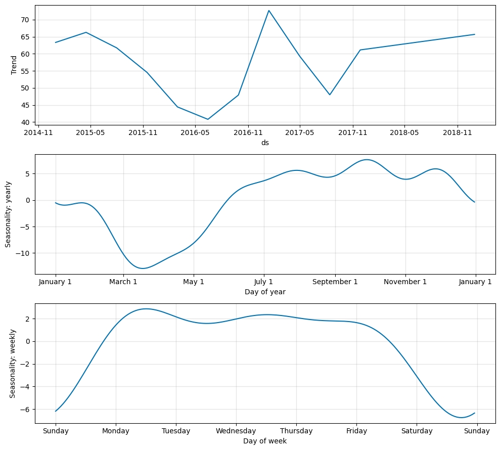 Прогноз состоит из следующих компонентов: тренд, годовая и недельная сезонность. Они складываются вместе, чтобы создать прогноз.