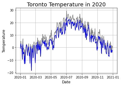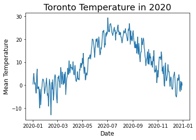 plt.title('Toronto Temperature in 2020', fontsize=18)